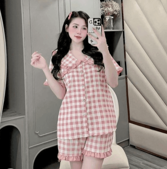 Pijama Cổ Bèo Công Chúa Chất Dũi Mát Caro Hồng Trắng Dễ Thương